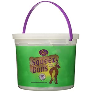 The Squeezy Buns Treats for horses, Approx 65pc- 3lb Tub gives you more than a handful of treats for your horse. Packaged in a plastic container, it is easy to preserve for a longer time. The Squeezy buns treat is a nutritious bite-sized treat with a great taste. The treats are individually wrapped to preserve their freshness and to eliminate mess. The natural treat with nutritional ingredients is one of the best horse treats.