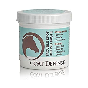 As the name implies, Coat Defense Trouble Spot is a topical treatment that works best on the affected area. It combats summer sores, mud fever, scratches, sweet itch, rain rot, girth rot, proud flesh, girth galls and insect bite allergies. The paste reinforces the skin as well as coat with a non-moisture environment. Then, it amplifies healing. Its thick consistency allows to form a protective barrier from moisture and destructive elements.